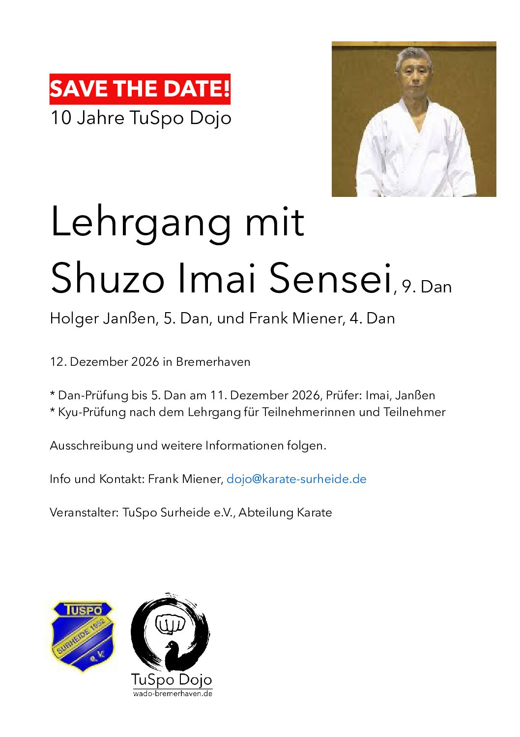 Lehrgang mit Shuzo Imai Sensei, 9. DanHolger Janßen, 5. Dan, und Frank Miener, 4. Dan Kyu-Prüfung nach dem Lehrgang für Teilnehmerinnen und TeilnehmerAusschreibung und weitere Informationen folgen.Info und Kontakt: Frank Miener, dojo@karate-surheide.deVeranstalter: TuSpo Surheide e.V., Abteilung Karate Dan-Prüfung bis 5. Dan am 11. Dezember 2026, Prüfer: Imai, Janßen