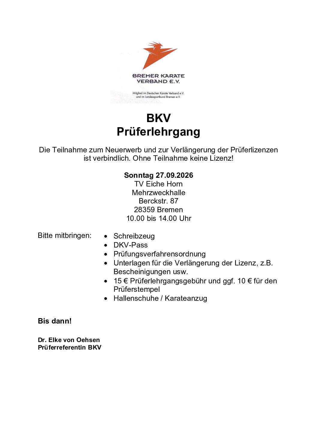 TV Eiche Horn, Bremen Berckstraße 87, Bremen, Bremen, DeutschlandDie Teilnahme zum Neuerwerb und zur Verlängerung der Prüferlizenzenist verbindlich. Ohne Teilnahme keine Lizenz!
