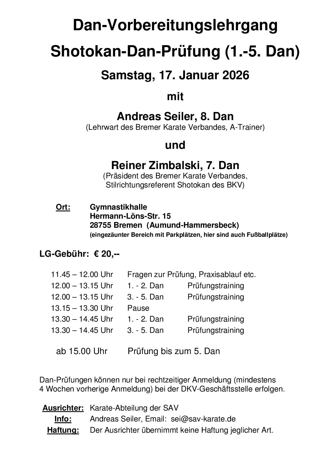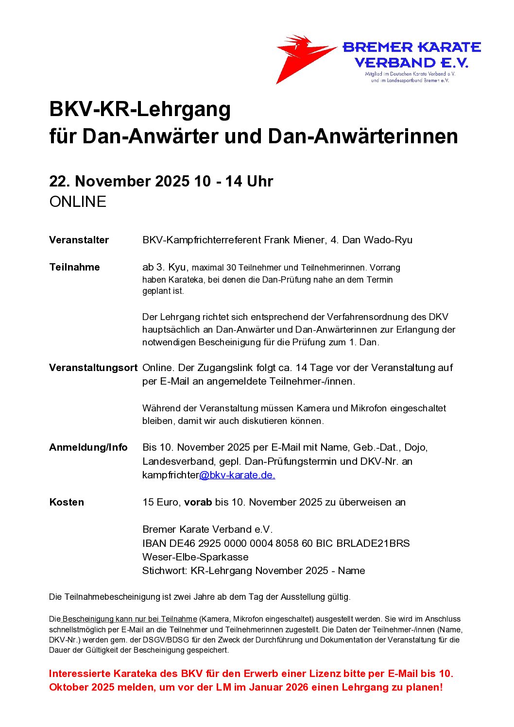 Veranstalter: BKV-Kampfrichterreferent Frank Miener, 4. Dan Wado-Ryu Teilnahme: ab 3. Kyu,maximal 30 Teilnehmer und Teilnehmerinnen. Vorrang haben Karateka, bei denen […]