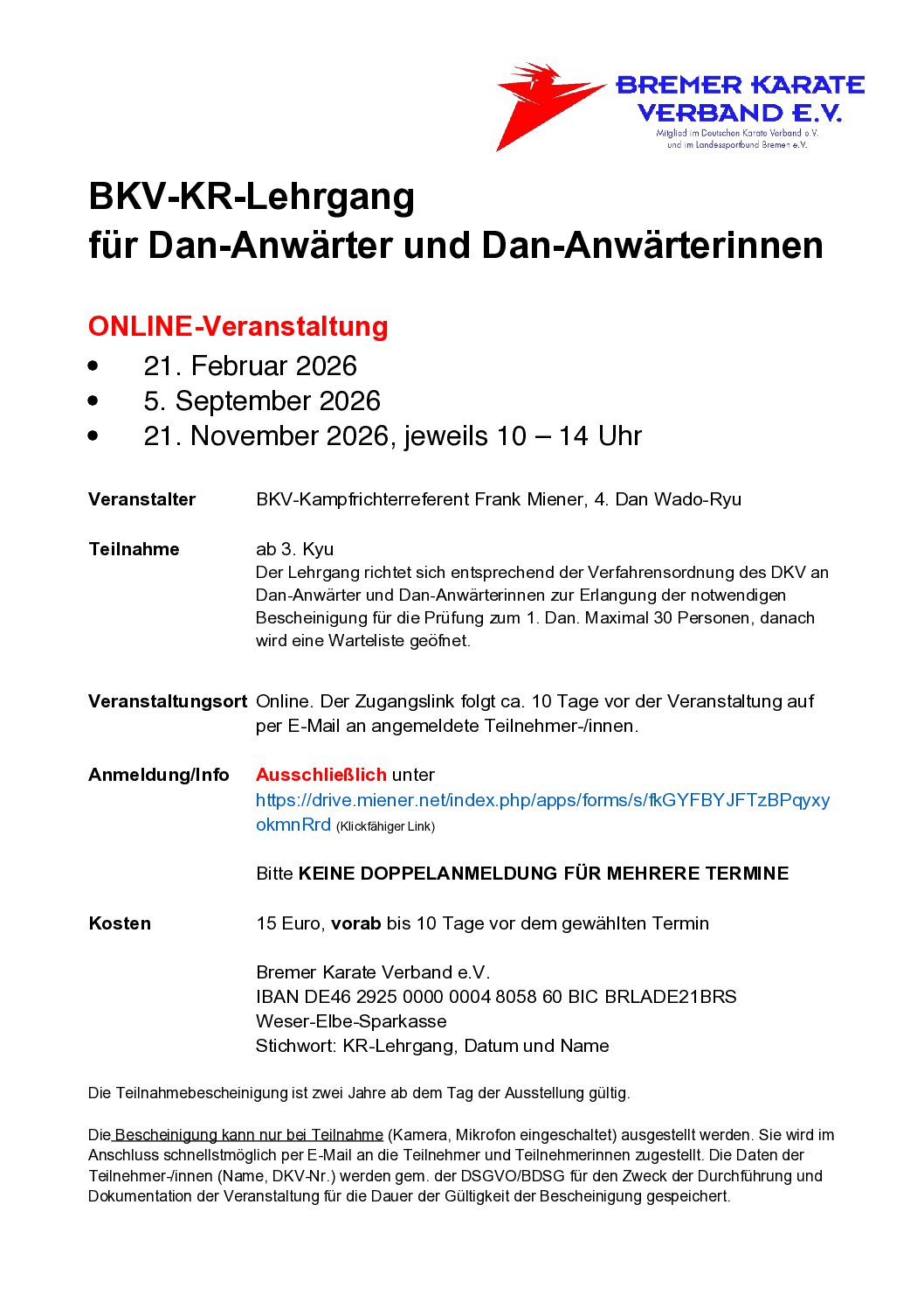 Ab Februar 2020 veranstatet der Bremer Karate Verband e.V. wieder Lizenz-Lehrgäng für Karate-Trainer und Trainer Assistenten: C-Trainer-Ausbildung Breitensport (Möglichkeit, zusätzlich […]